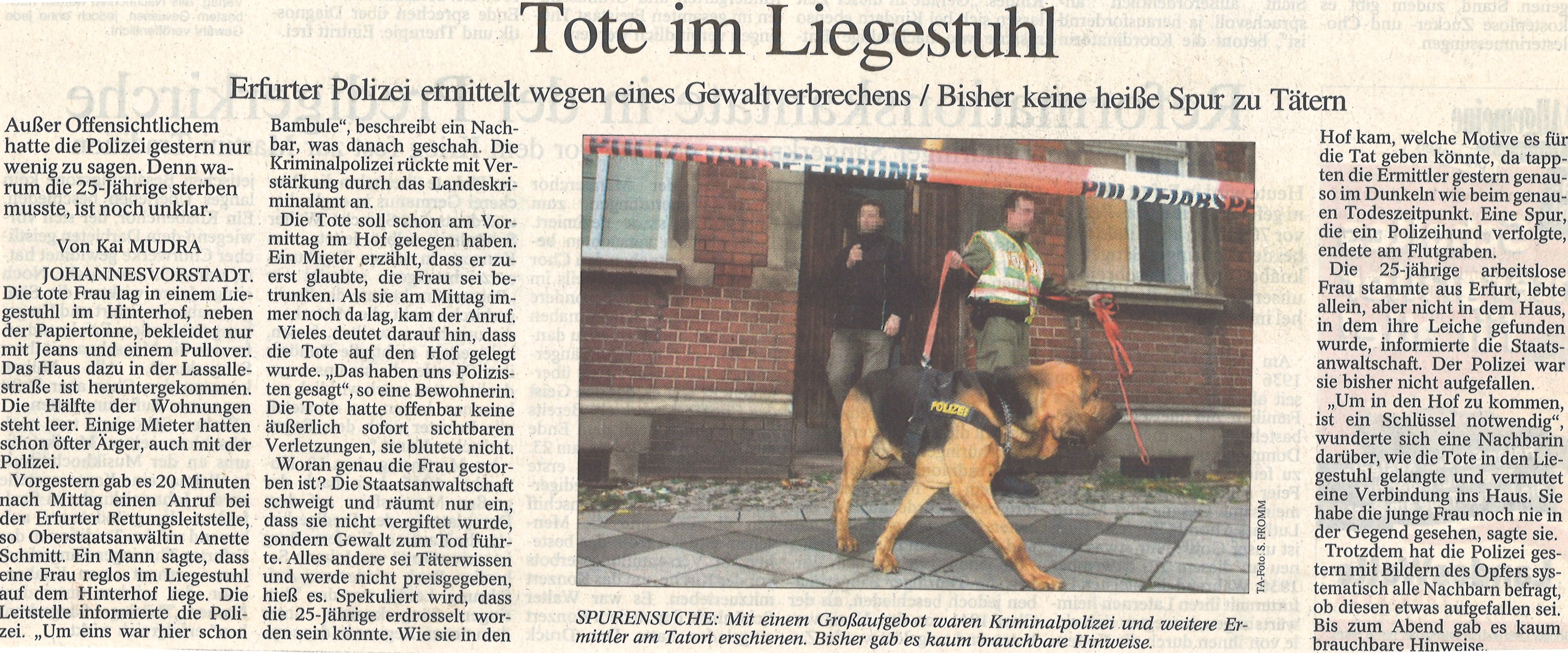 - Die Tote lag stundenlang im Hof (Hallo Erfurt vom 10.06.2007)